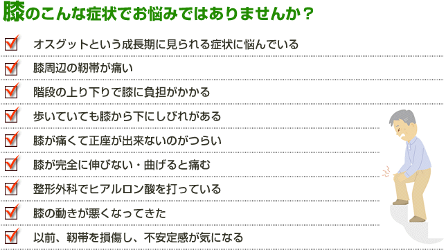 膝の痛みには様々な理由があります。体重の増加や、加齢による関節の変形や、痛風を原因とする異物の蓄積による炎症など、一人一人の膝の痛みの症状も理由も様々です。