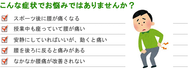 学生の分離症の場合は運動の際に痛みはあるが、安静にしていれば痛みはなくなる、また運動をすると痛みが出現するなど繰り返しの痛みで気づく学生さんは多いです。